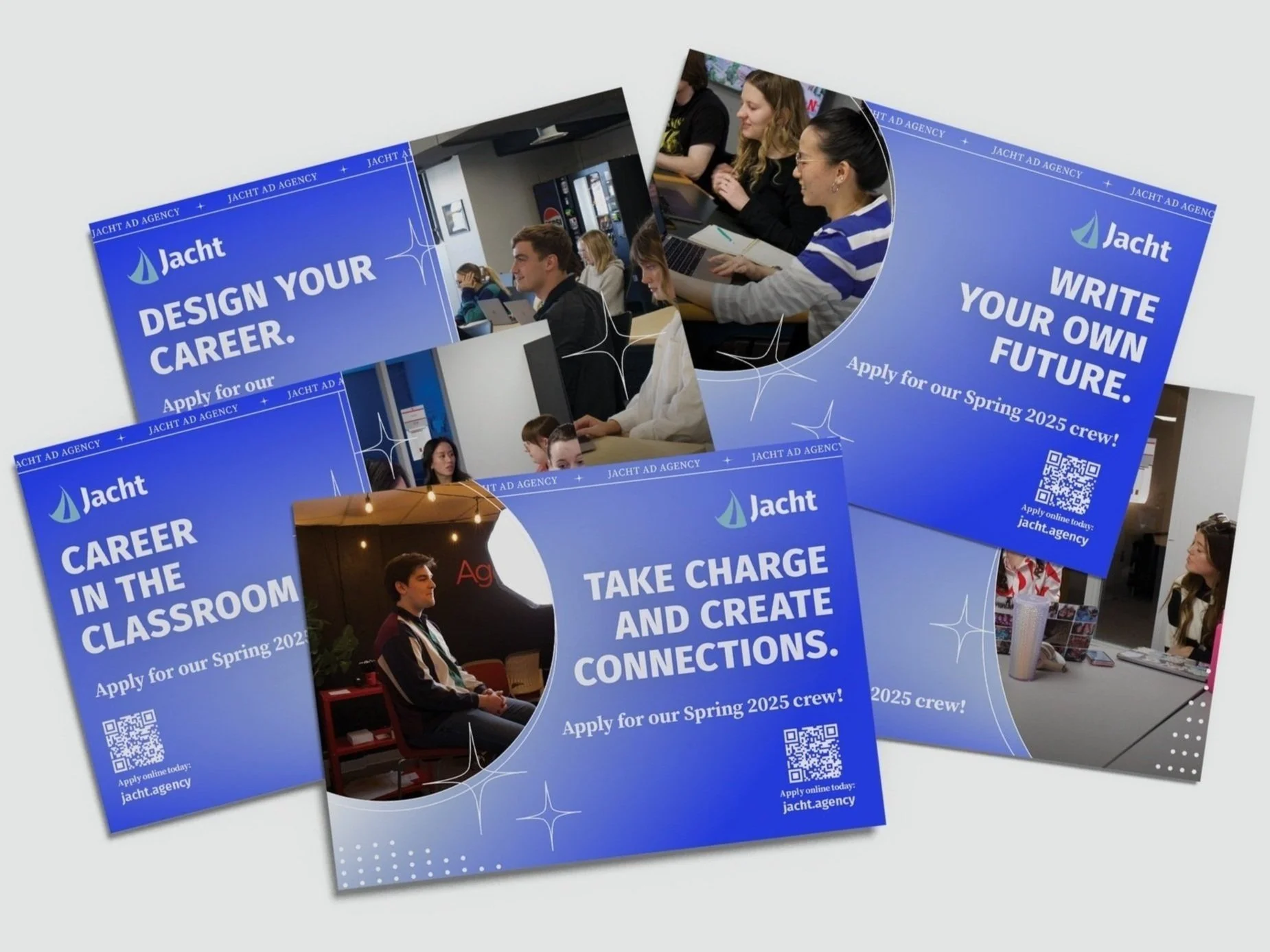 As part of a brand refresh for Jacht, my co-designer and I had the exciting opportunity to design apparel and create a variety of promotional materials for this student-run advertising agency. This project includes eye-catching advertisements for Instagram, striking posters, engaging digital signage, and vibrant postcards, all crafted to elevate the company’s brand presence. My designs aim to capture the agency's unique, youthful spirit and effectively connect with its audience across multiple platforms, ensuring a cohesive and impactful promotional campaign.