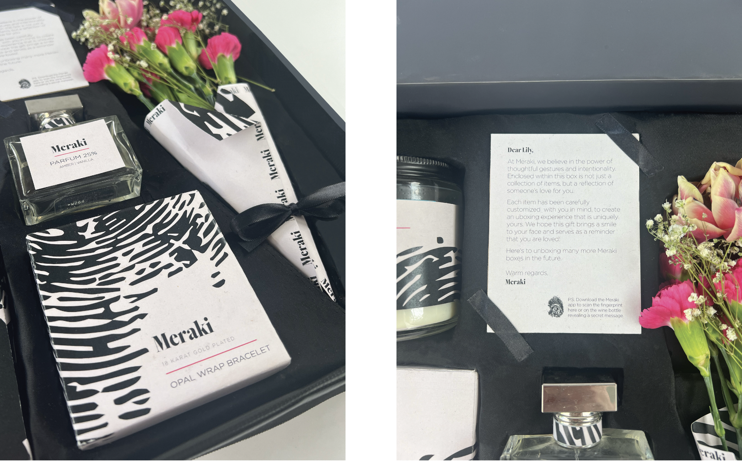 Meraki offers intentionality at its finest. This is a gift-giving experience that is designed and conceptualized by you, as the buyer, to create your own meaningful unboxing experience for the one that you love. Show them that you care and that you’ve been listening to their preferences by giving them this box based on intentionality. Through this experience, Meraki allows for the customization of the box’s color palette, as well as of each and every item that the gifted person will receive.